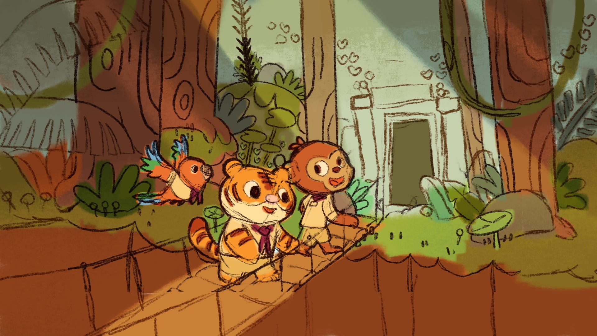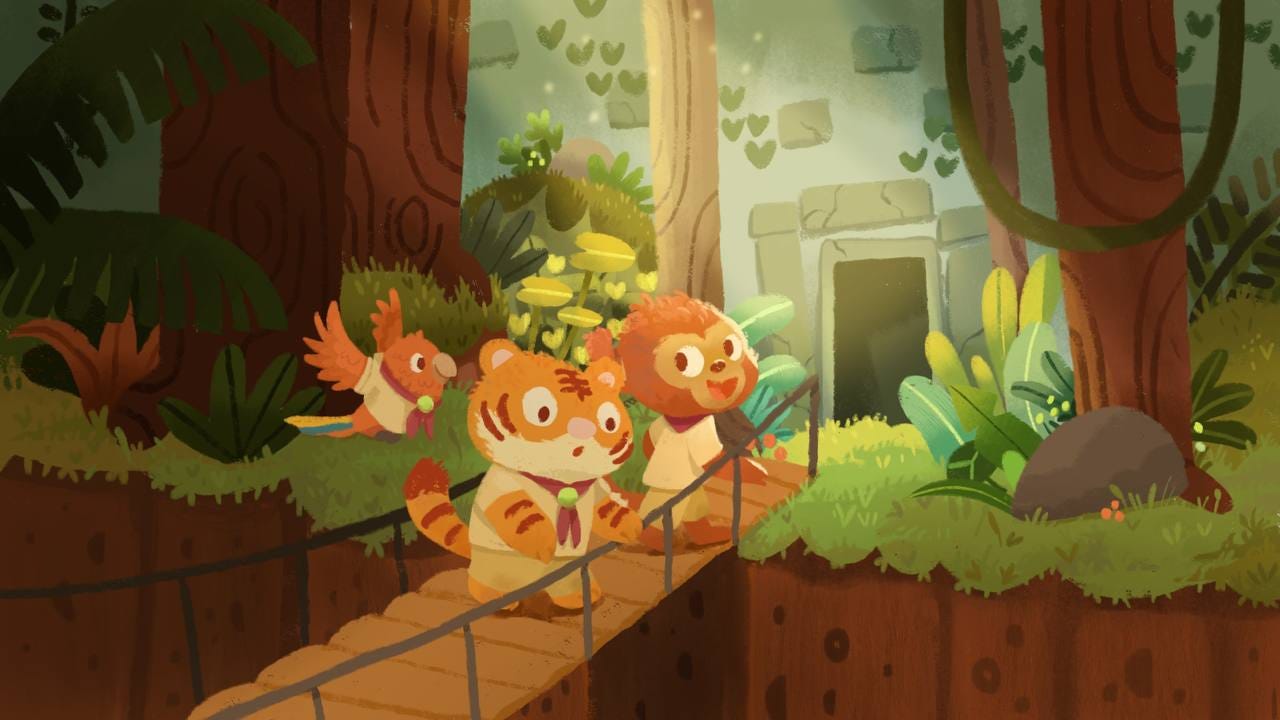 The central theme is adventure—the thrill of doing something new. In this story, our characters—a little tiger, a macaw, and a monkey—are crossing a bridge that separates them from their destination: a hidden jungle temple. Each one reacts differently: the tiger, fearful yet curious; the monkey, enthusiastic and eager to help; the macaw, free and carefree.