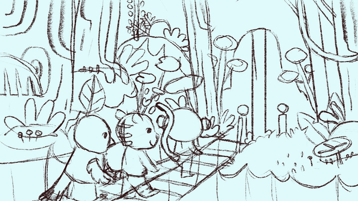 Inicialmente, el templo no existía en la escena; en su lugar, había una cascada que los personajes buscaban. Pero estaba demasiado lejos del puente y diluía el punto de la exploración, así que la transformé en la entrada a un templo en ruinas.
